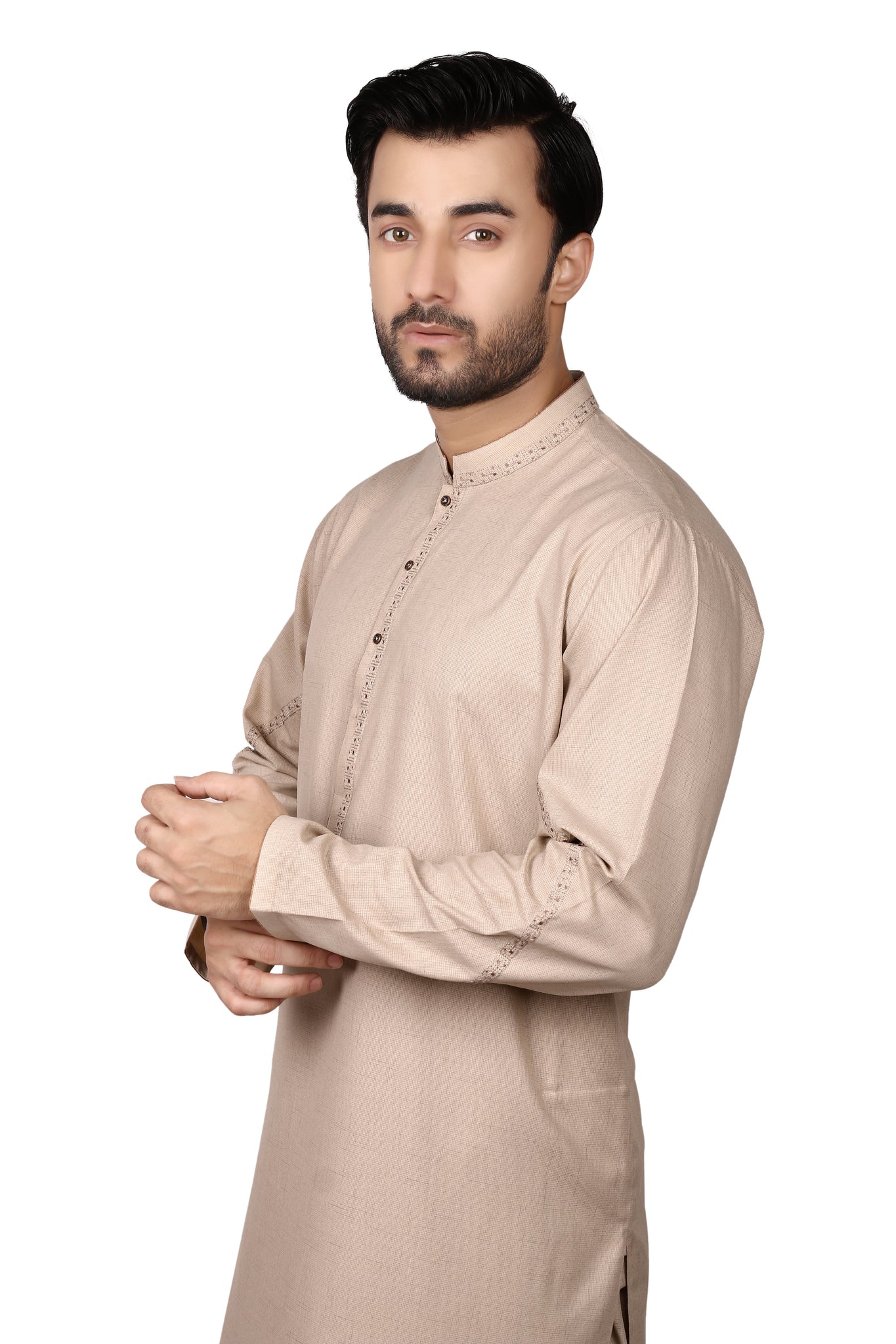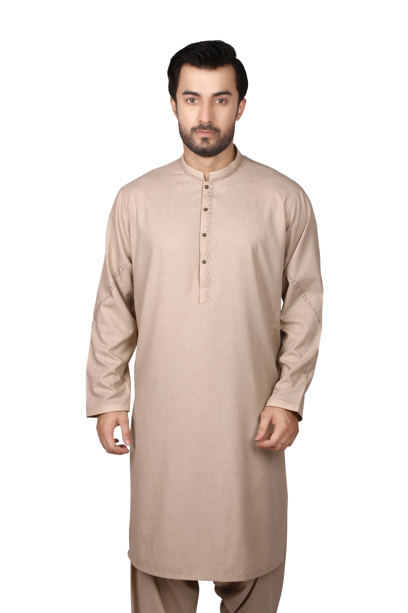 Men's Regular Kurta Shalwar suit. It comes with the Matching Shalwar. The material is cotton mix wash n wear. soft material. Machine embroidery.