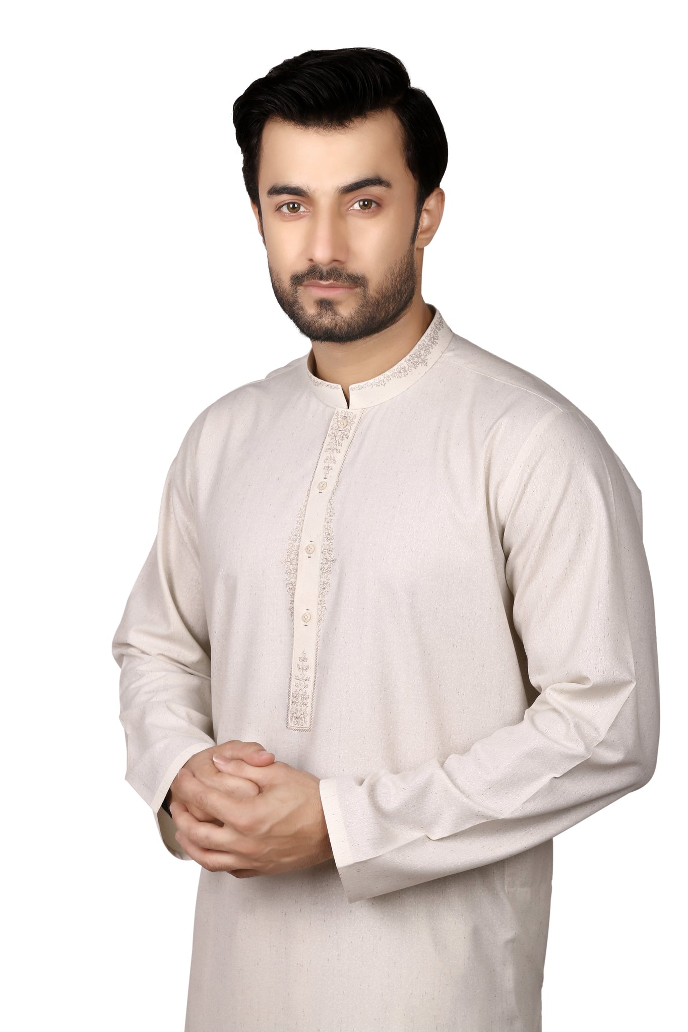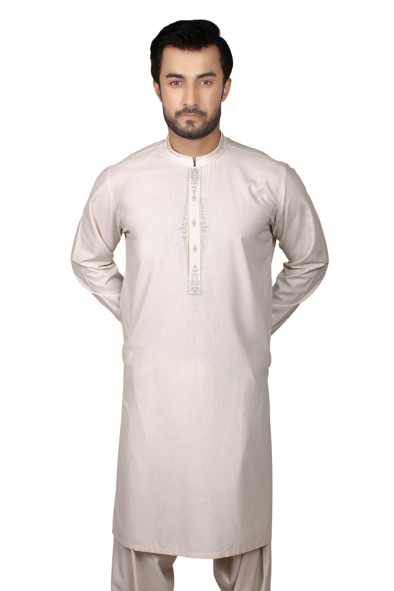 Men's Regular Kurta Shalwar suit. It comes with the Matching Shalwar. The material is cotton mix curandy texture. soft material. Machine embroidery.