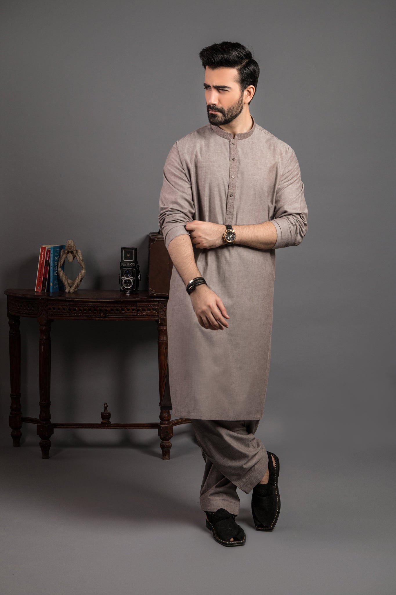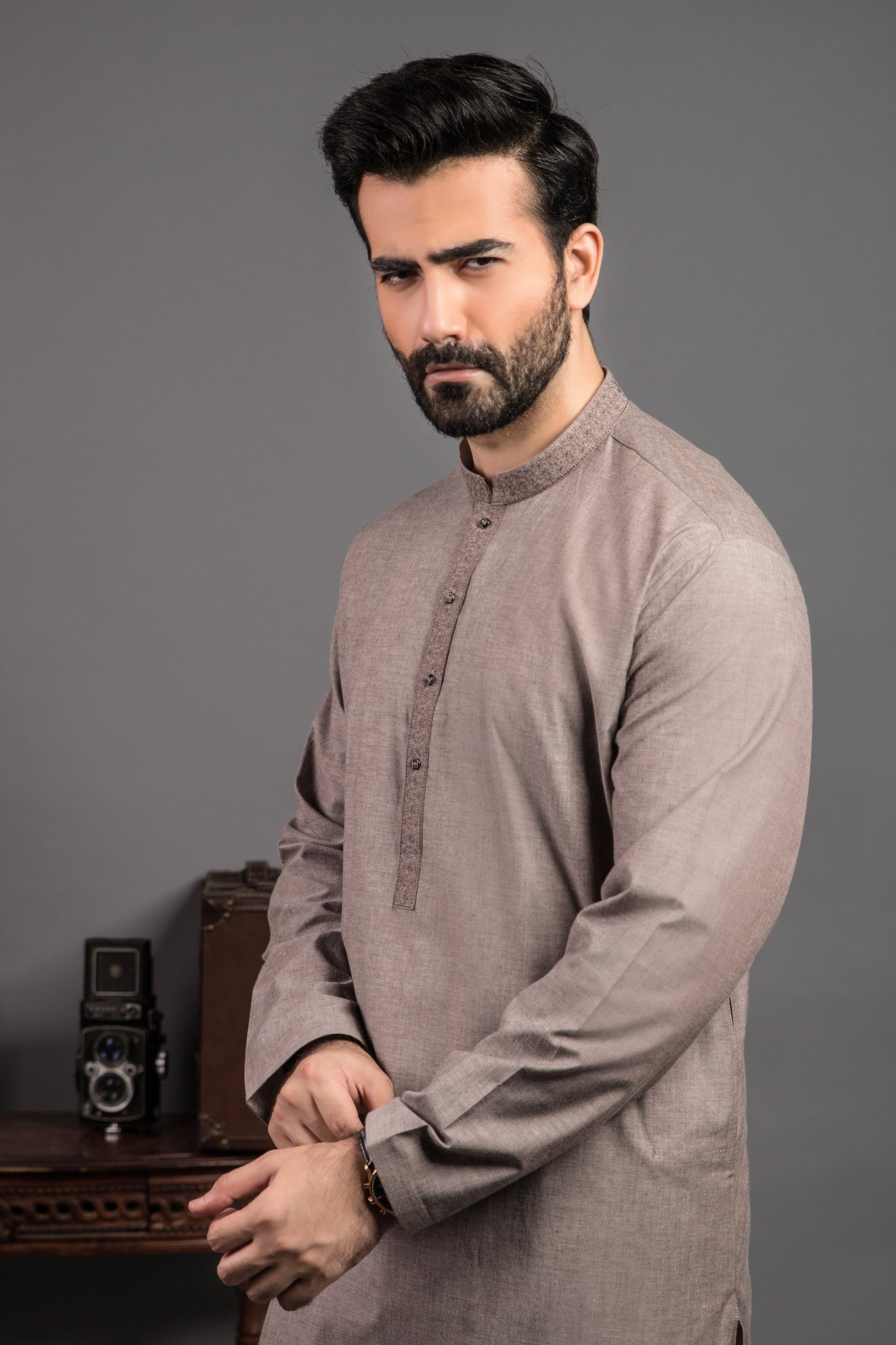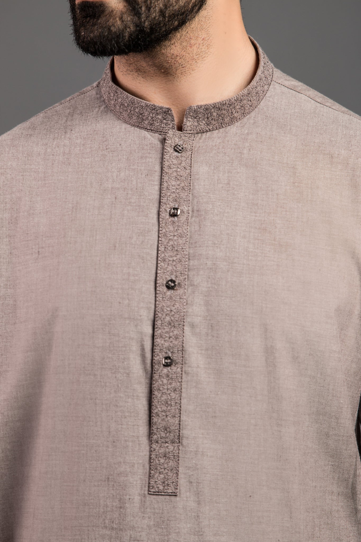 Men's Regular Kurta Shalwar suit. It comes with the Matching Shalwar. The material is cotton mix wash n wear. soft material. Machine embroidery.
