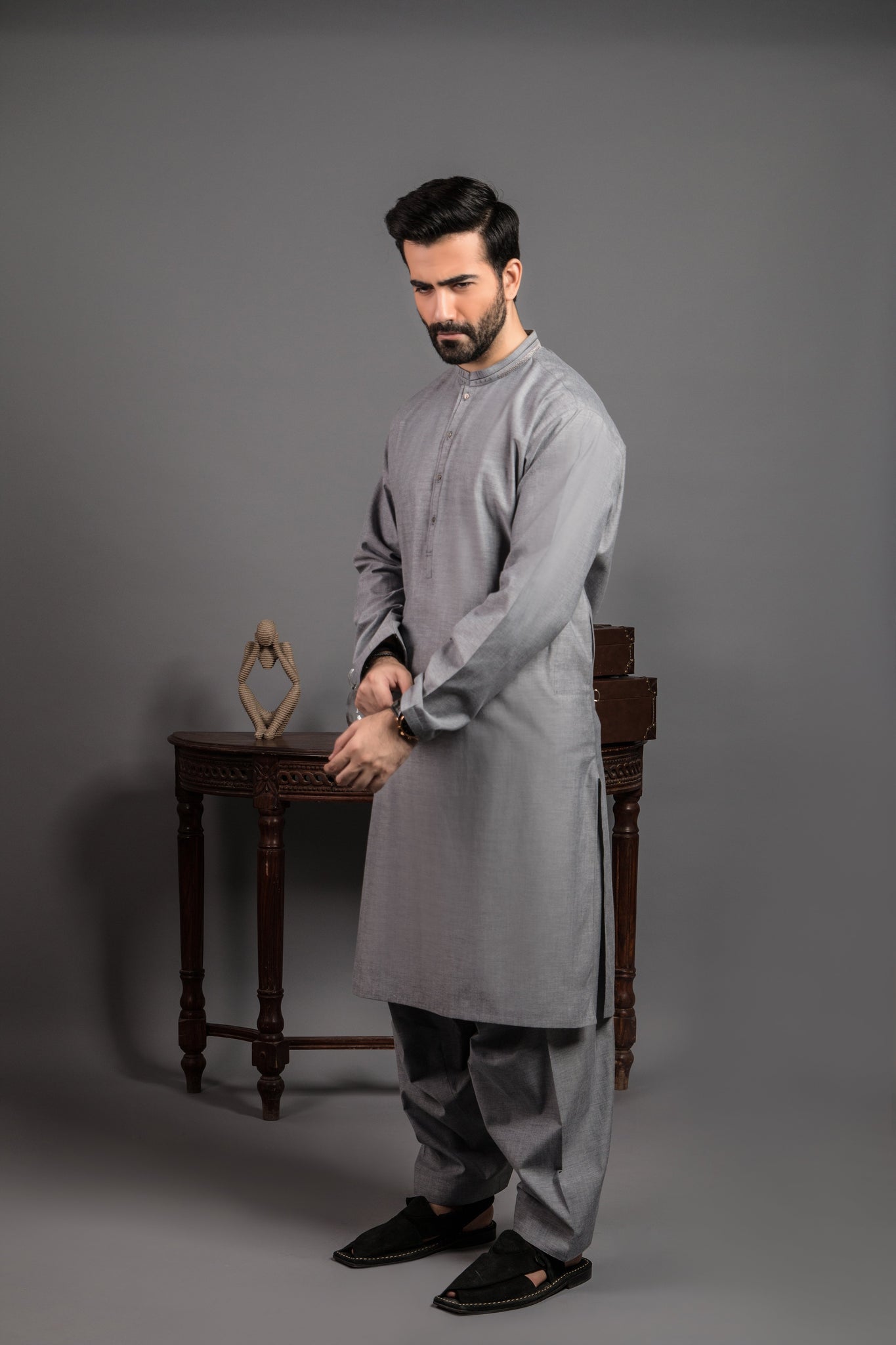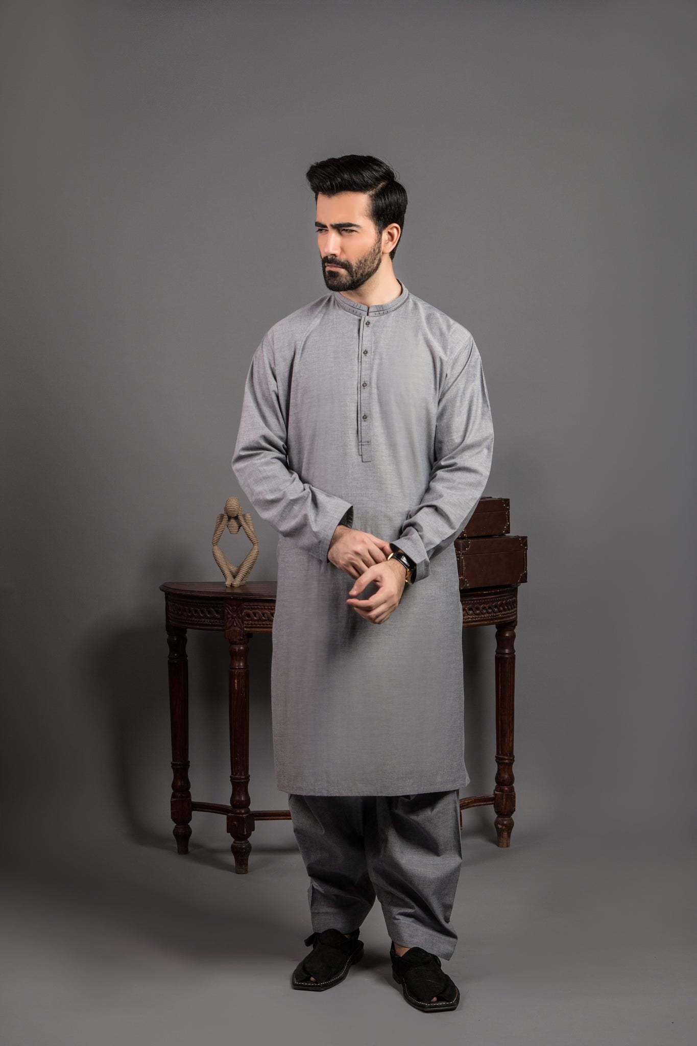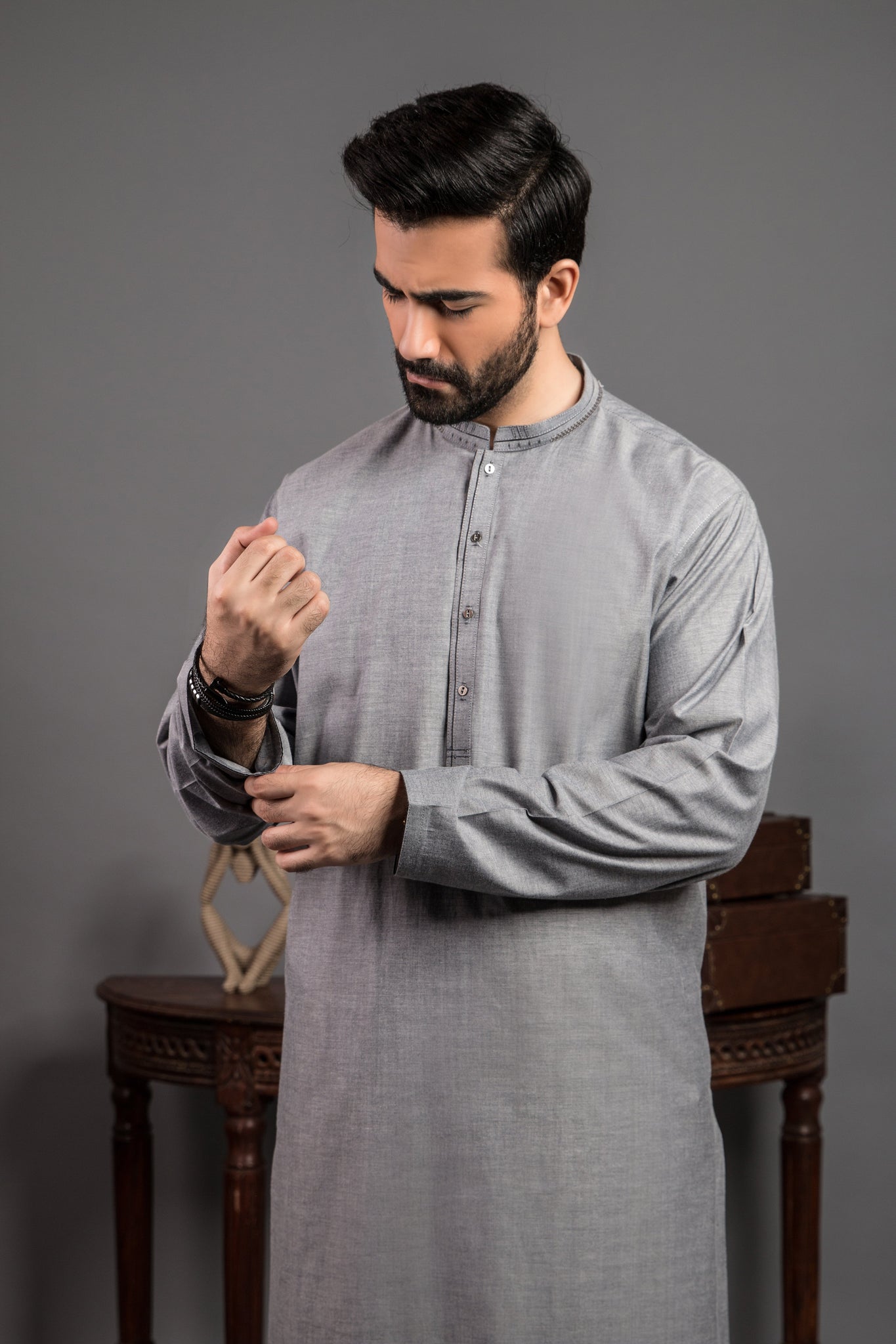Men's Regular Kurta Shalwar suit. It comes with the Matching Shalwar. The material is cotton mix wash n wear. soft material. Machine embroidery.