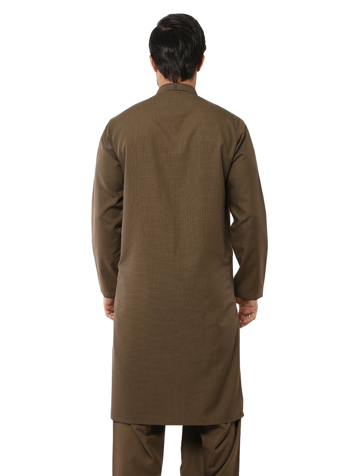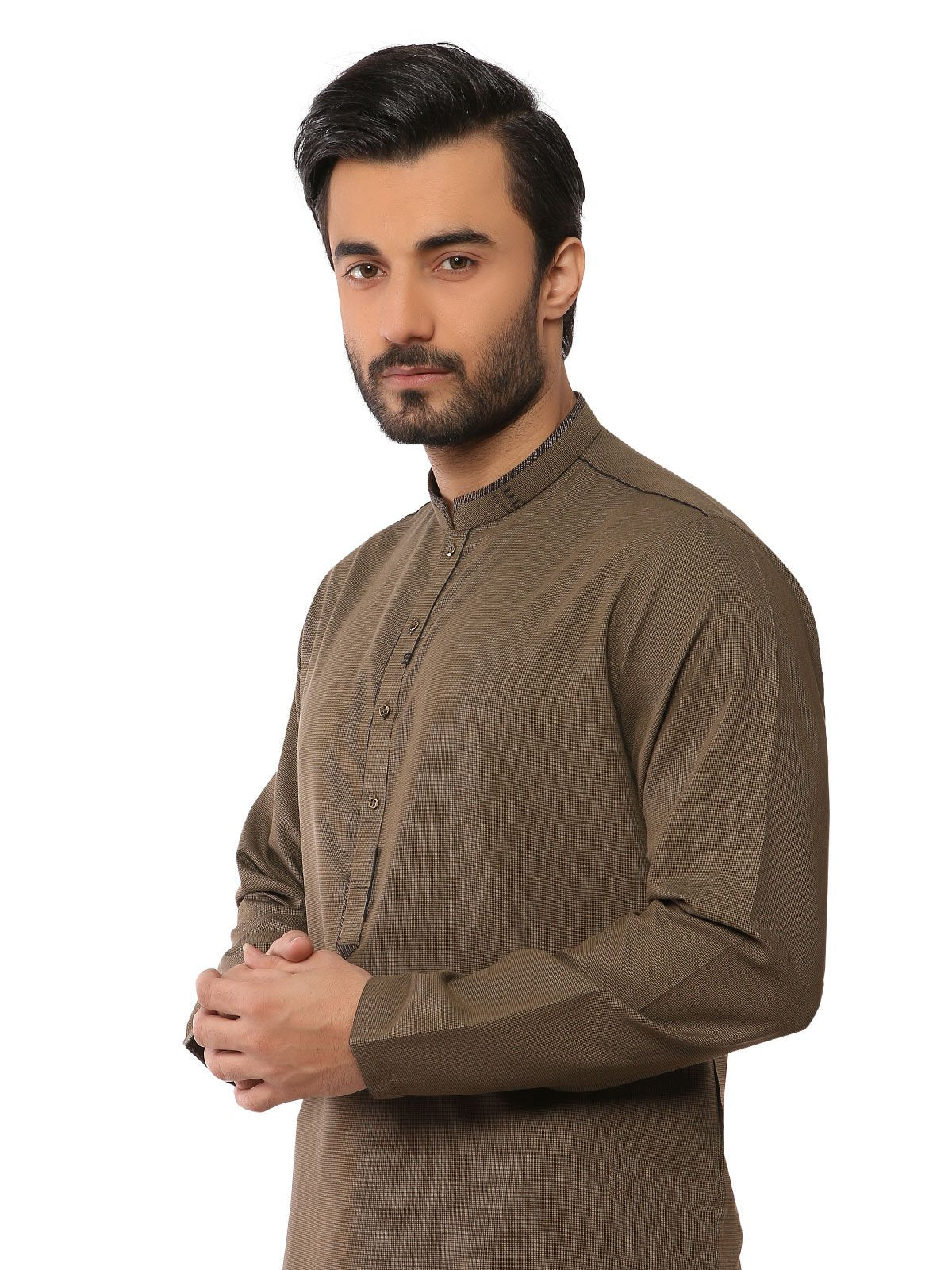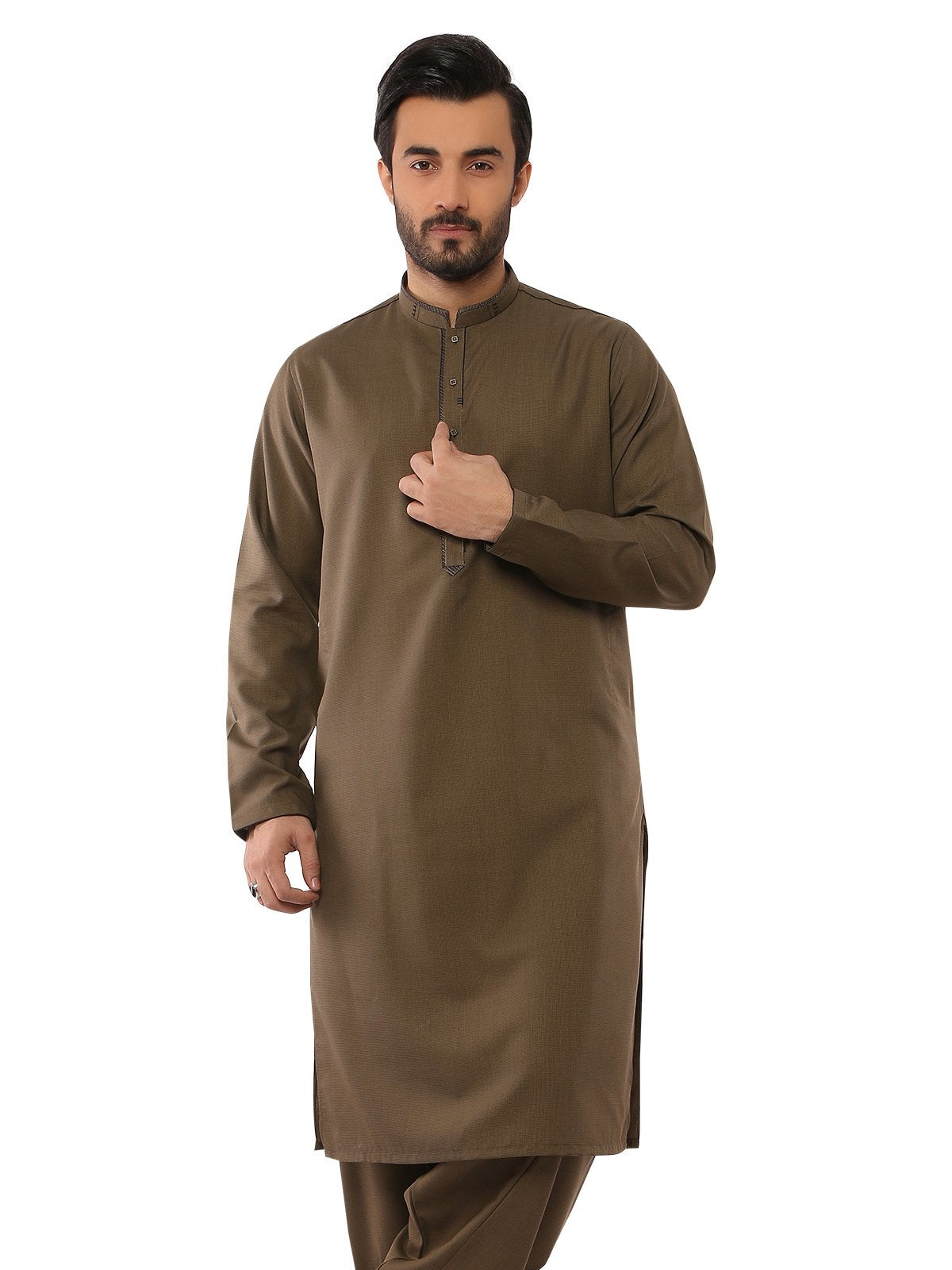 Men's Regular Kurta Shalwar suit. It comes with the Matching Shalwar. The material is cotton mix wash n wear. soft material. Machine embroidery.