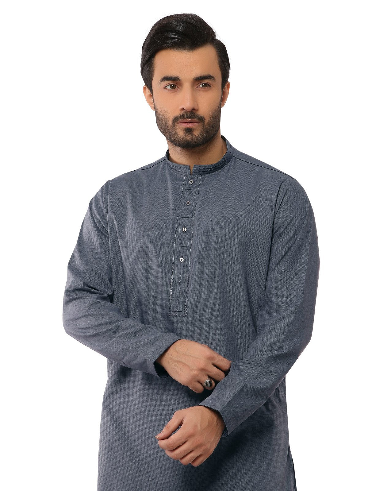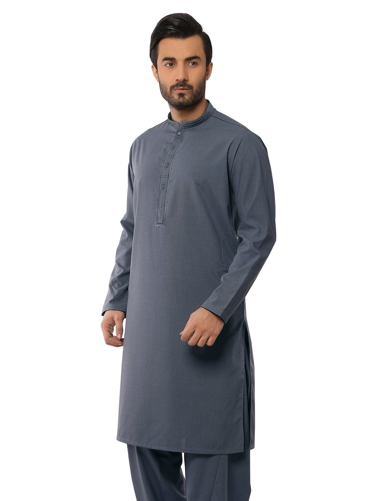 Men's Regular Kurta Shalwar suit. It comes with the Matching Shalwar. The material is cotton mix wash n wear. soft material. Machine embroidery.