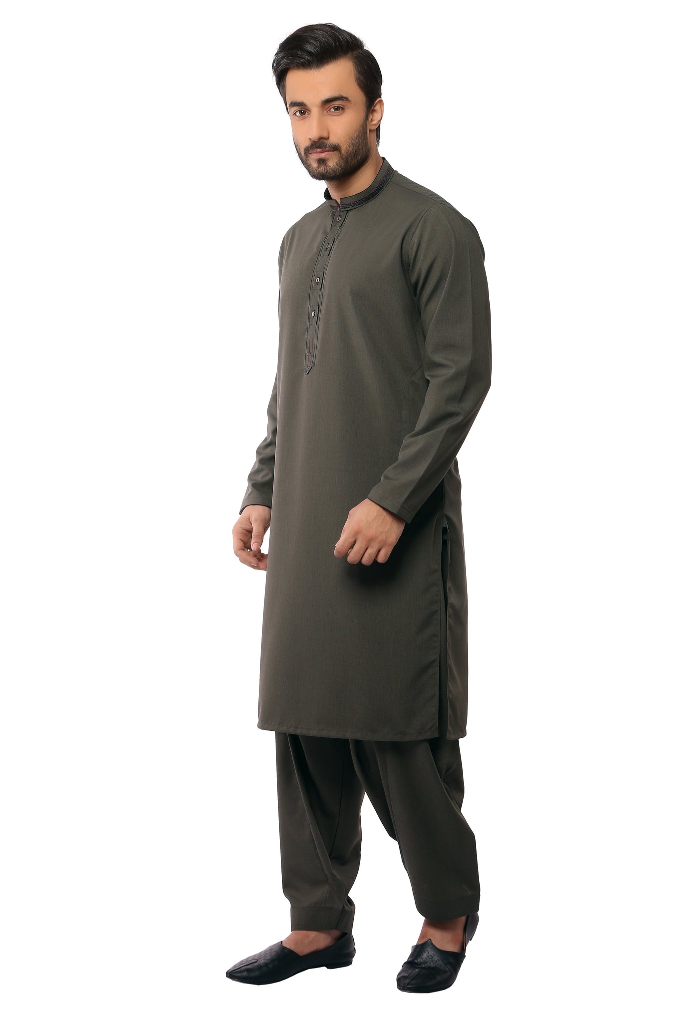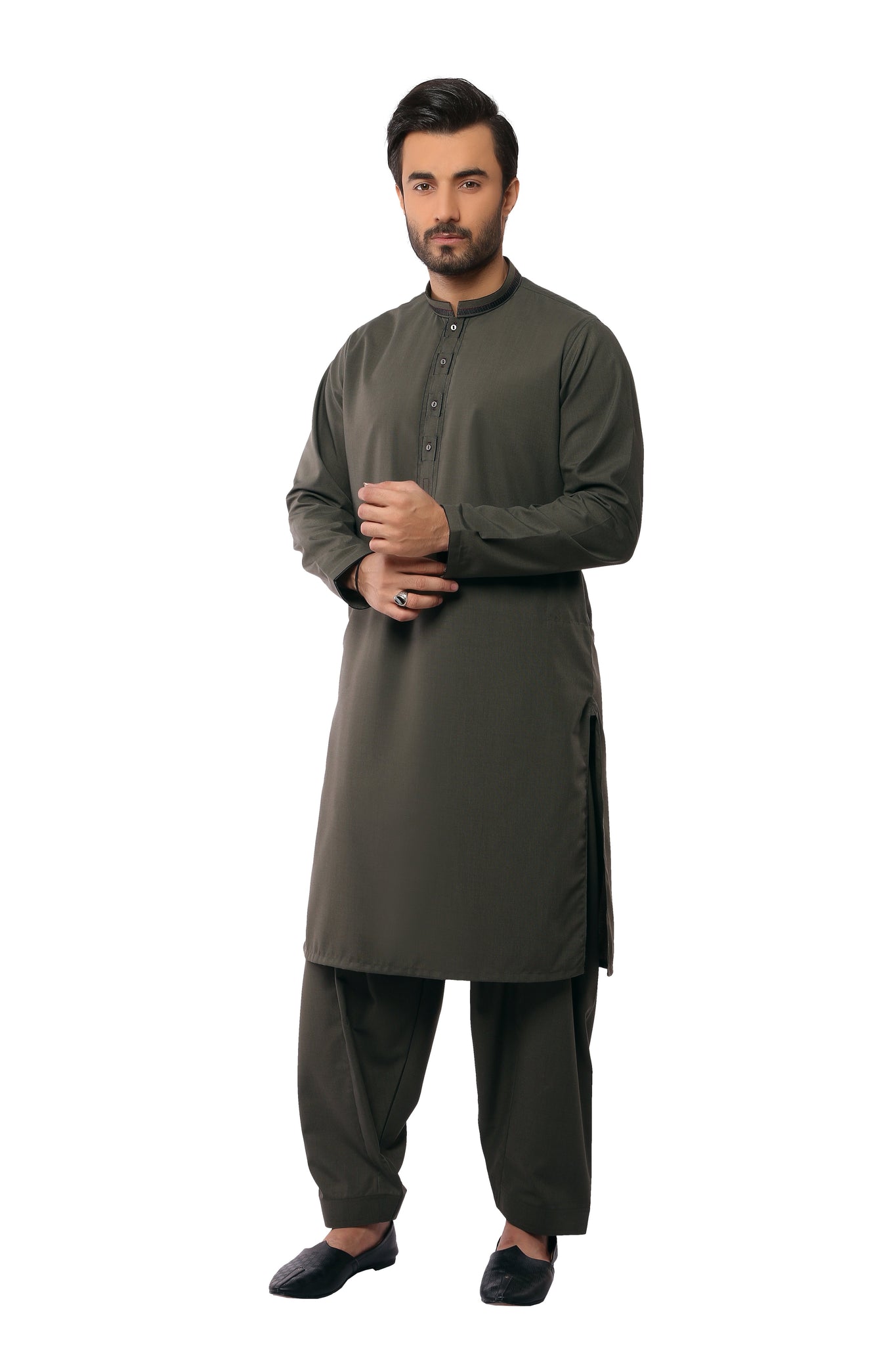 Men's Regular Kurta Shalwar suit. It comes with the Matching Shalwar. The material is wash n wear. soft material. Machine embroidery.