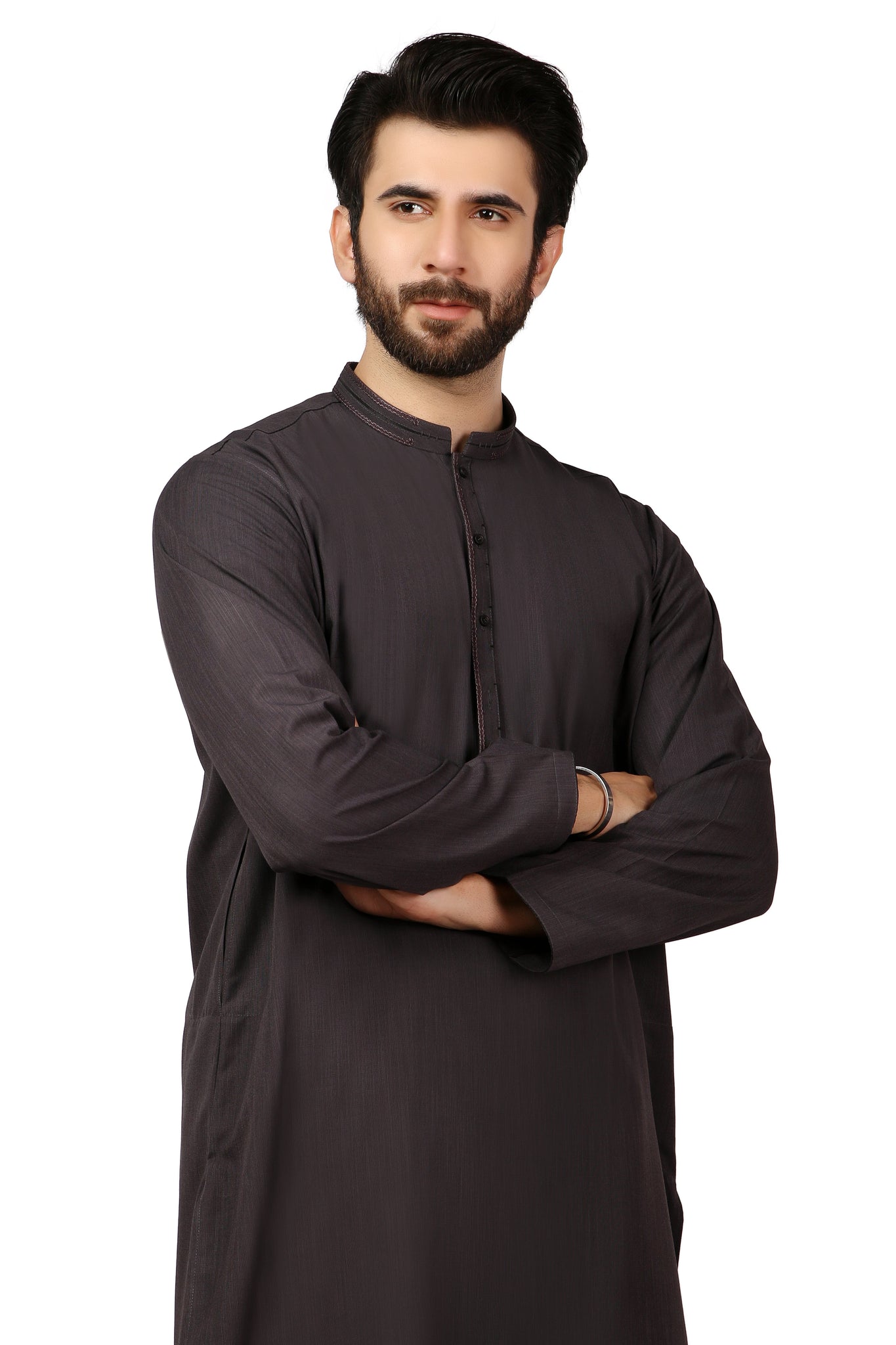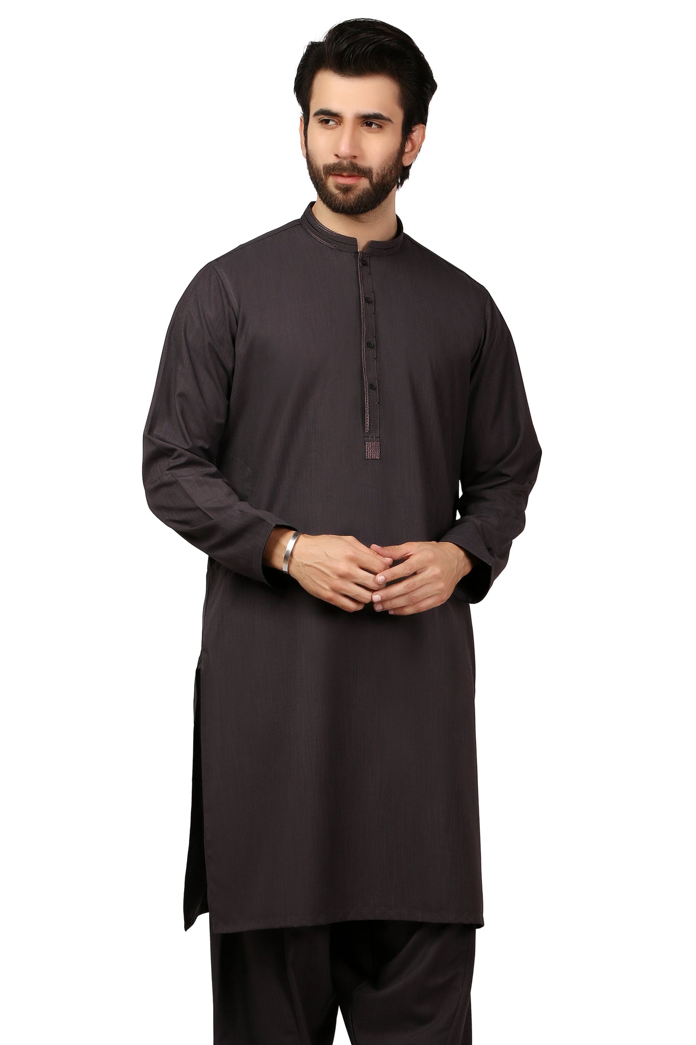 Men's Regular Kurta Shalwar suit. It comes with the Matching Shalwar. The material is cotton mix wash n wear. soft material. Machine embroidery.