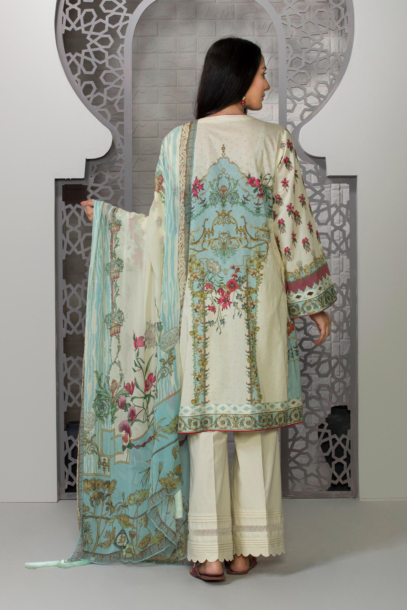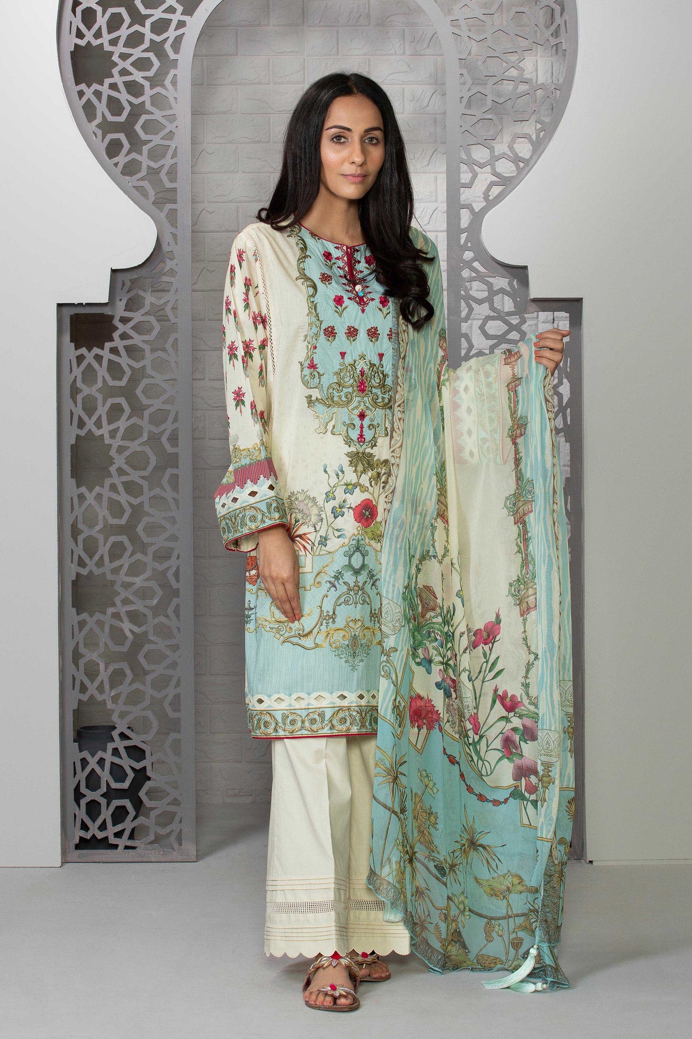 Stitched  Three Printed suit. Embroidered neckline. Sleeves and daaman are printed. No piping on the borders of sleeves and daaman. Chiffon dupatta and plain bell-bottom