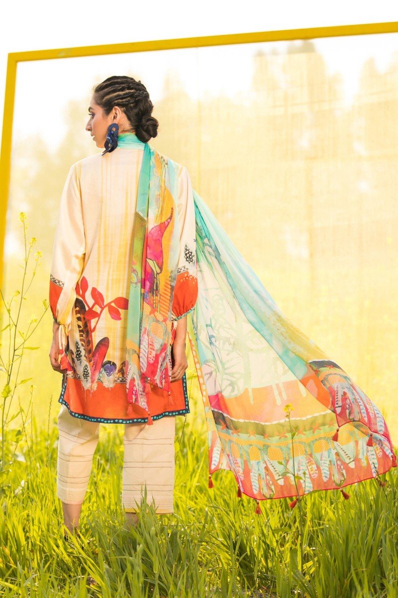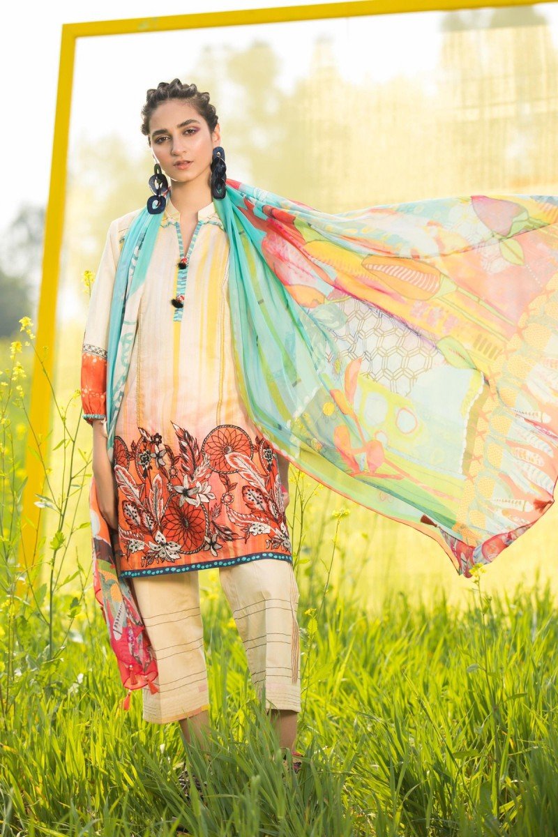 Stitched Lawn three pieces suit embroidered. Regular Sleeves, Plain upper front. Dyed plain bottom. Printed chiffon dupatta. Shirt Length is 36"