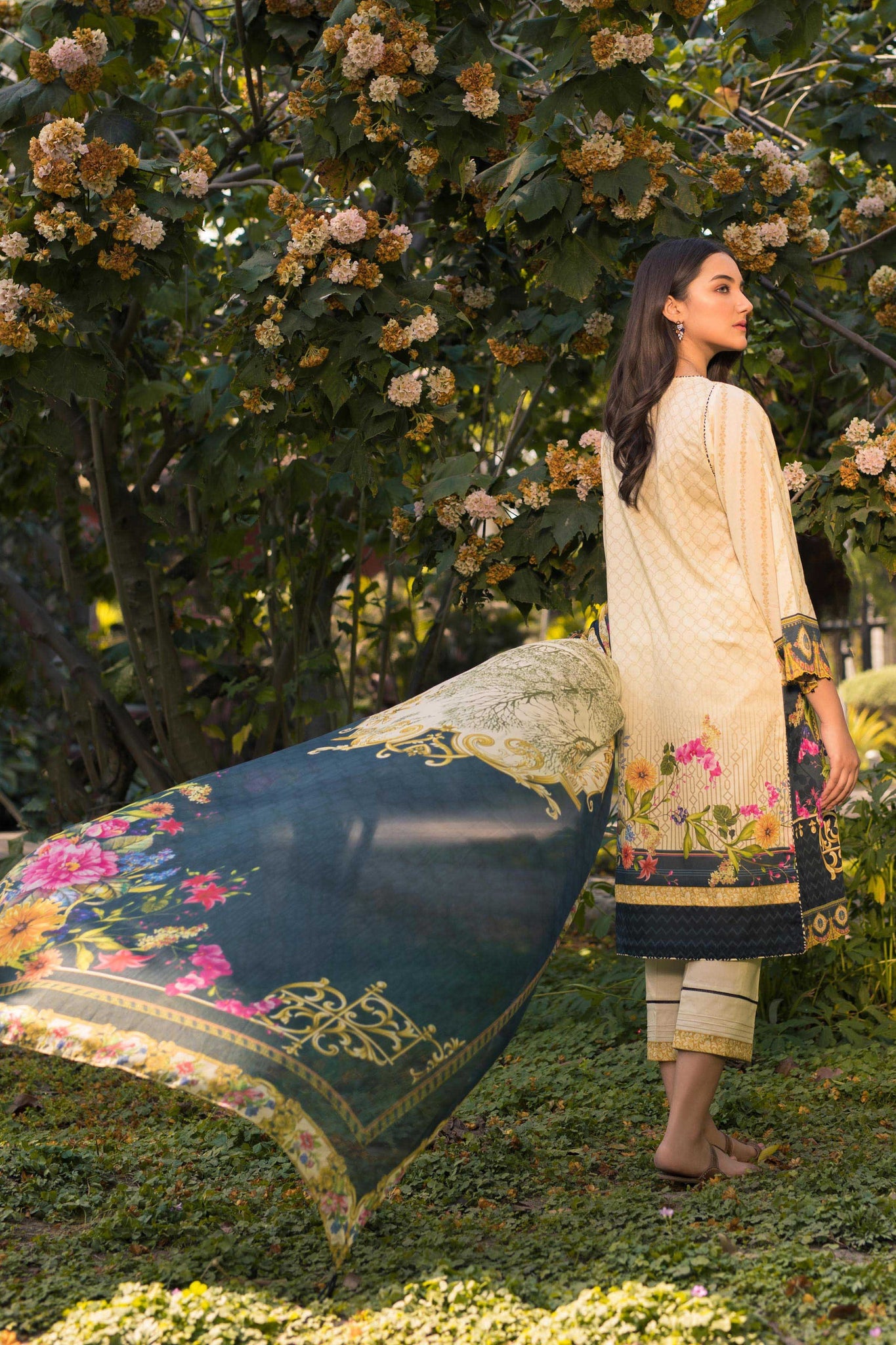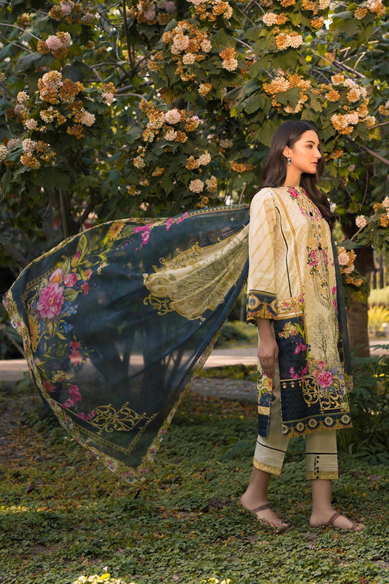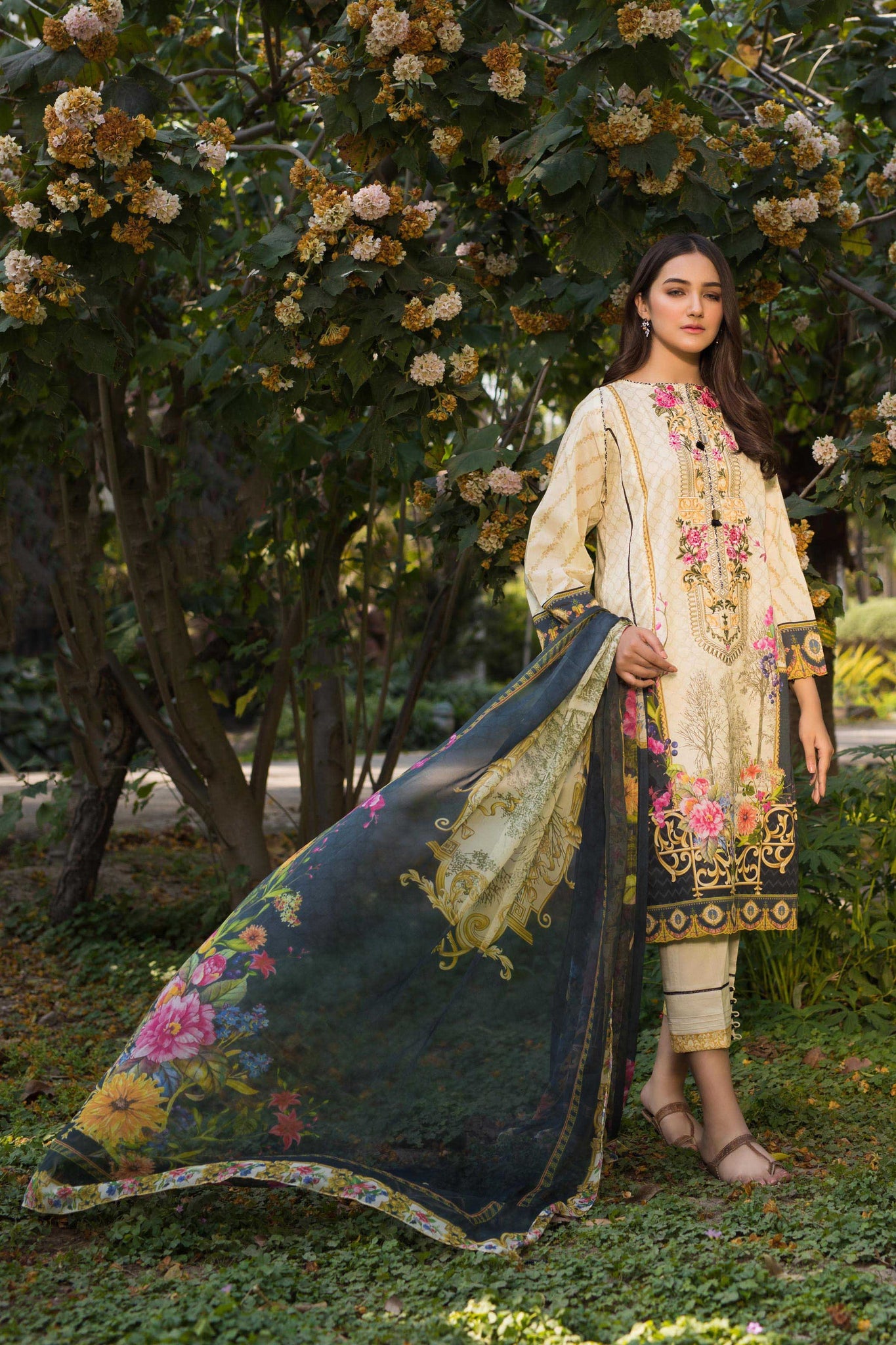 Stitched three pieces suit with chiffon dupatta. A-Line shirt. No beads on shirt or dupatta. Plain dyed bottom. No tassels on dupatta.