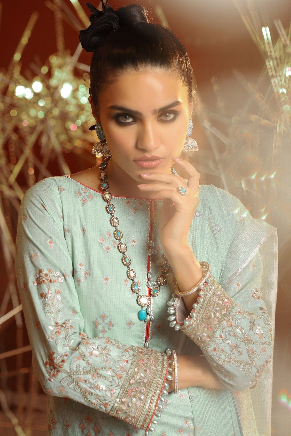 1. Stitched Embroidered Three pieces suit. Accessories used on actual suit are different than the suit in the pictures. No tassels on Dupatta. Jacquard embroidered net dupatta.
