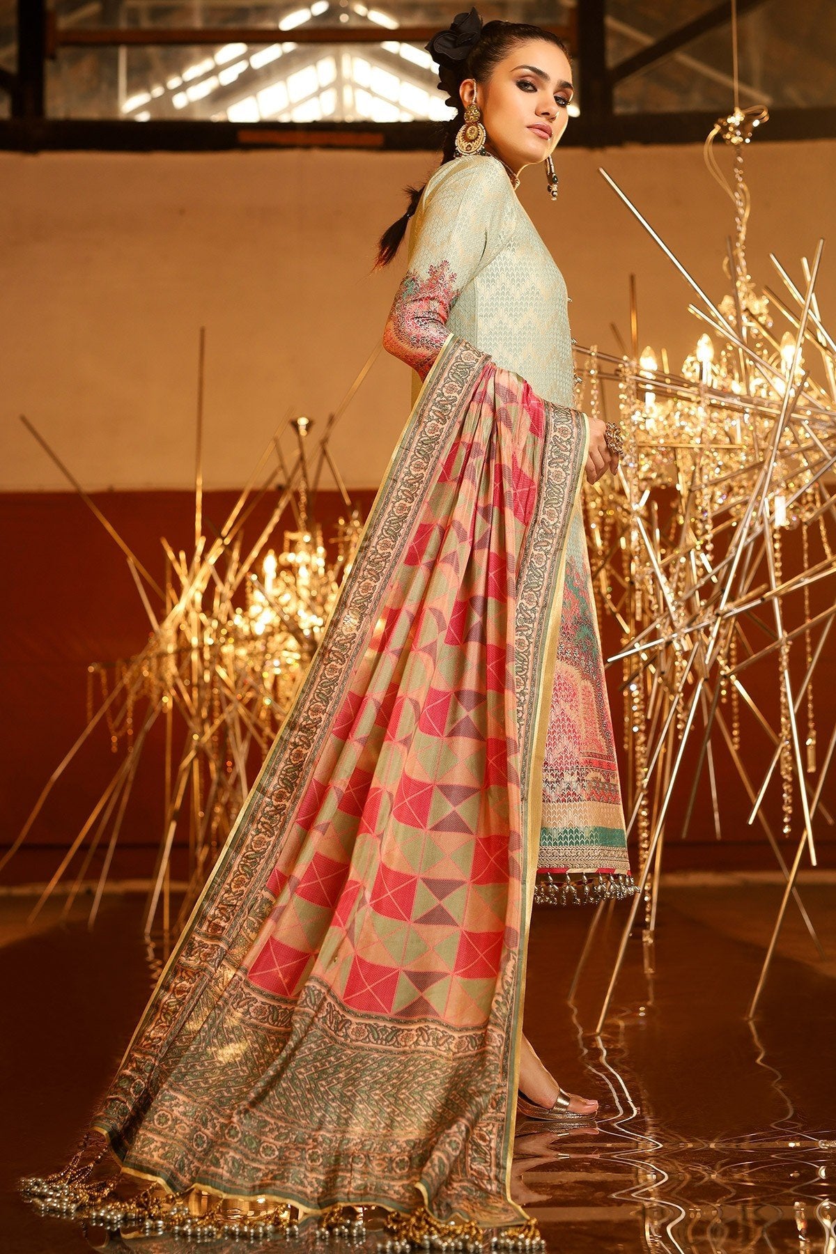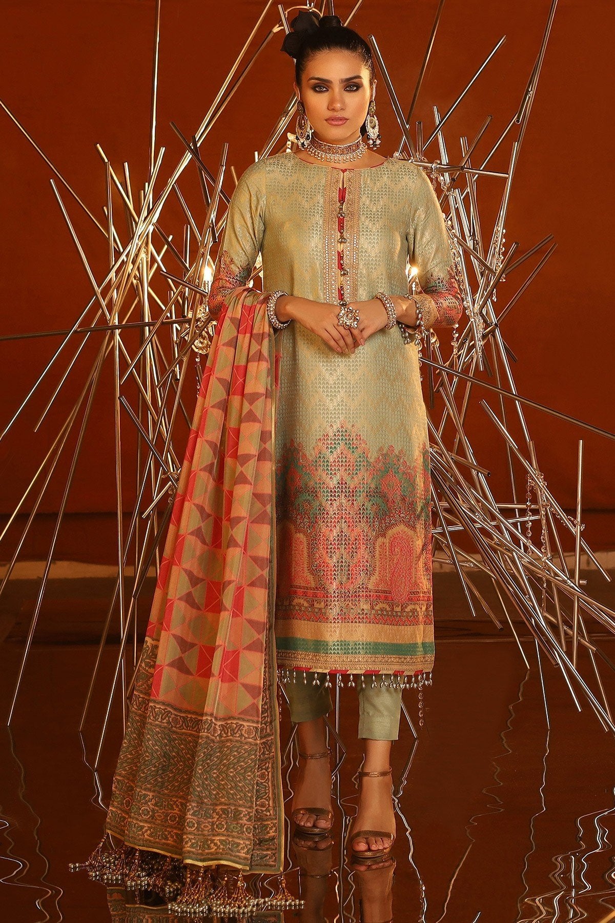 - Digital printed Jacquard shirt. Organza embroidered patti on neckline slightly different than the one in the picture. Embroidered organza patti on sleeves and daaman borders. No piping on Boat-neck.
