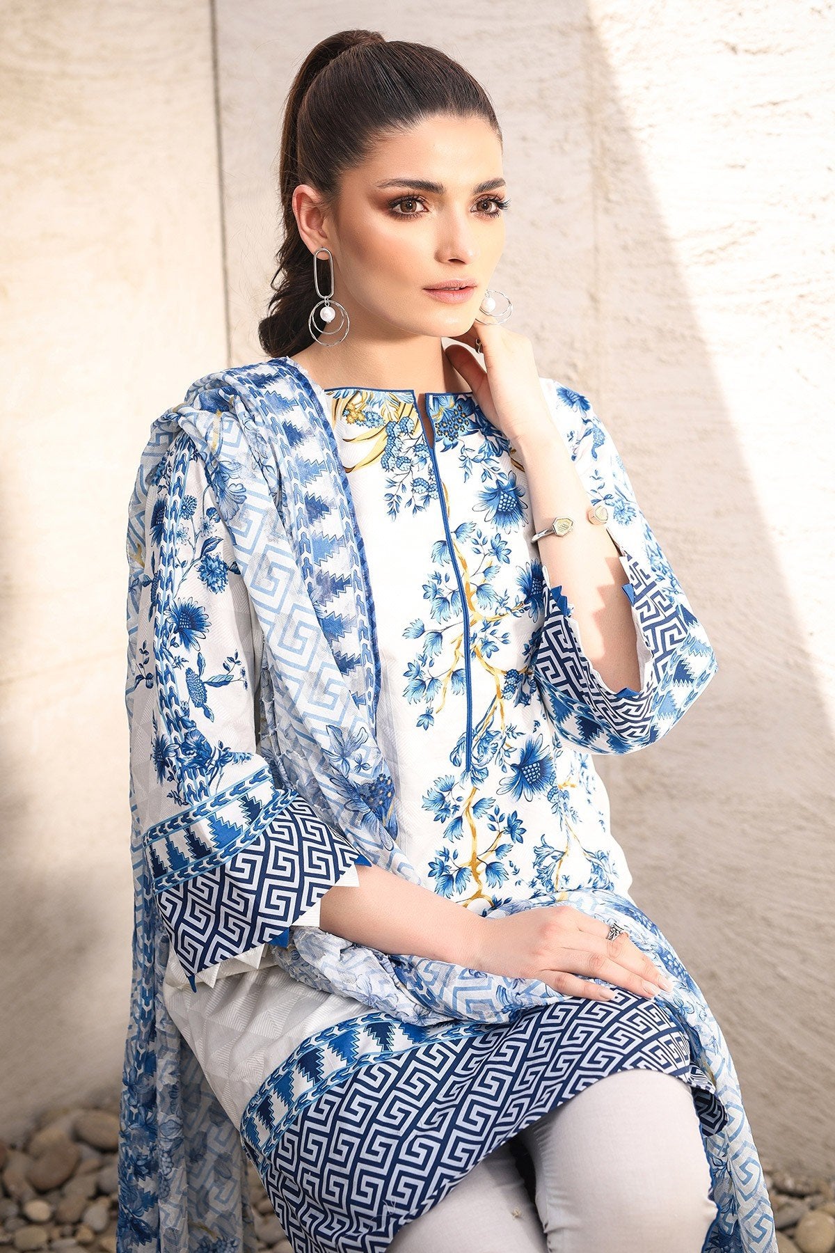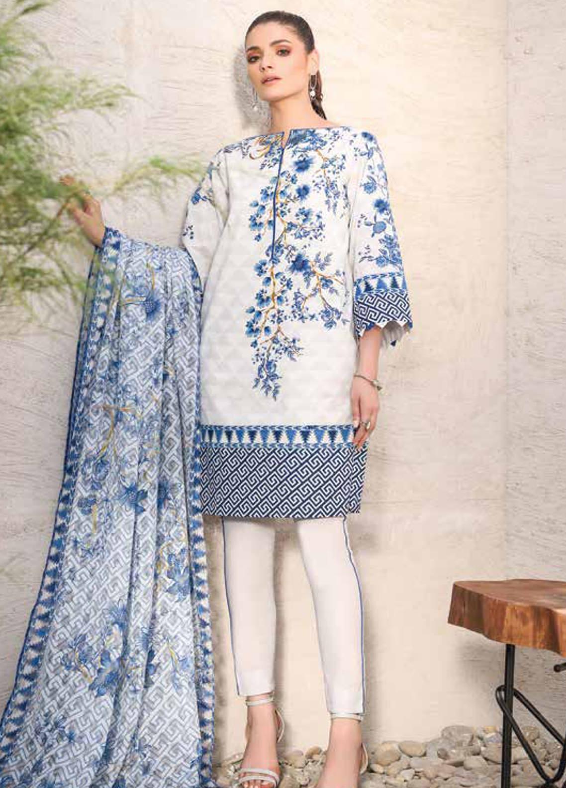 Three Piece Printed Suit With Jacquard Net Dupatta.
